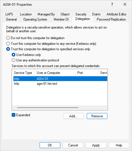 In the settings of the AGW AD object, activate Kerberos delegation only for specific services.
